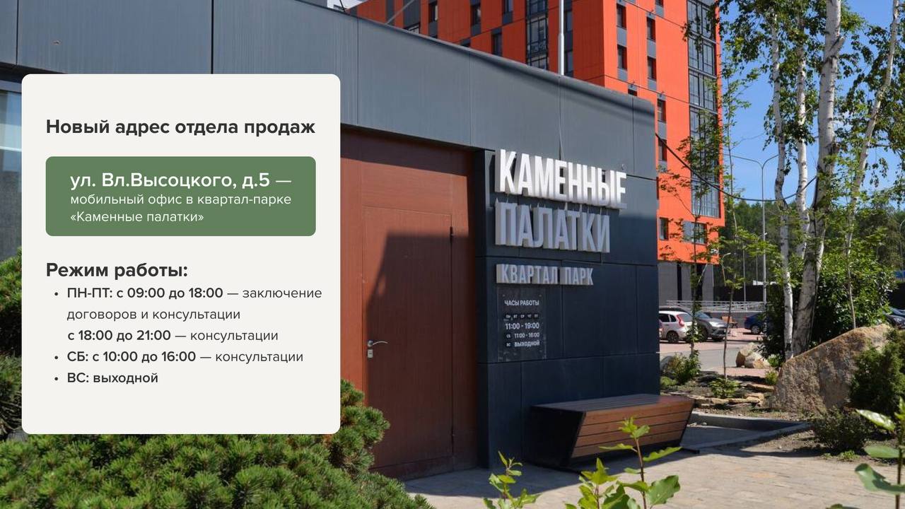 ул. Вл. Высоцкого, д. 5 (мобильный офис в квартал-парке «Каменные палатки»). Как и раньше, ждем Вас: пн-пт с 9ч до 21ч, сб с 10ч до 16ч — в нашем новом офисе.