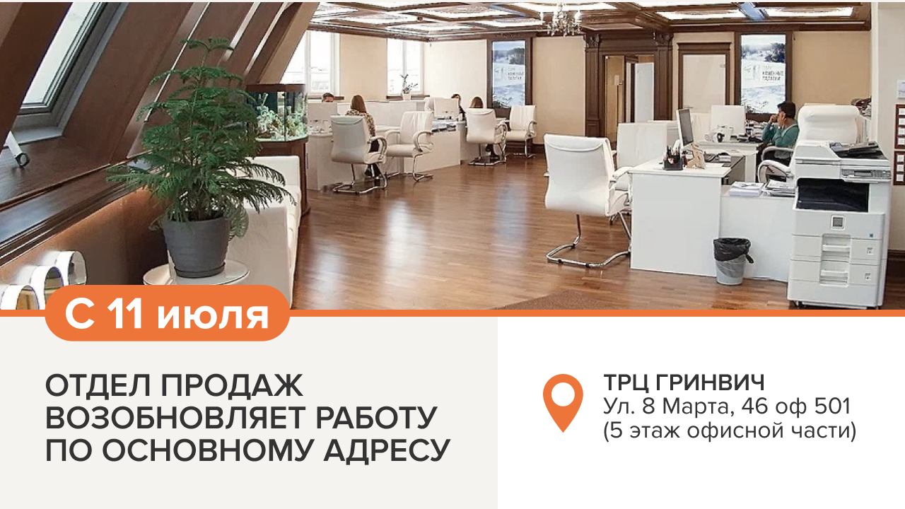 Уважаемые партнеры и клиенты, с 11 июля офис продаж «Гринвич недвижимость для жизни» возобновляет работу по основному адресу в ТРЦ «Гринвич»: